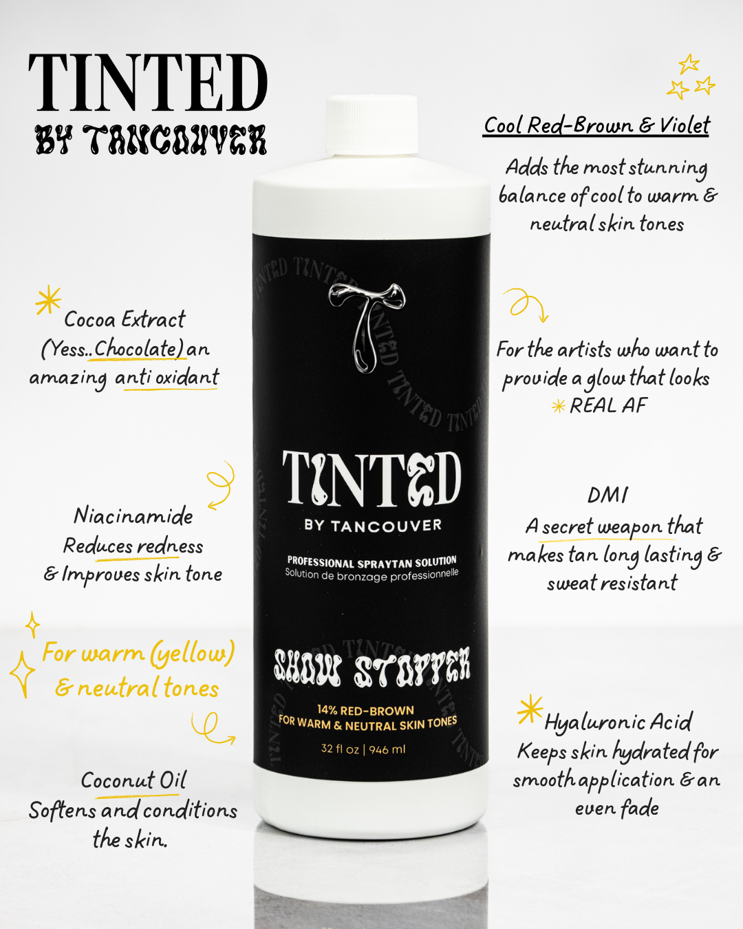 Formulated with a Cool fusion of Red-Brown & Violet undertones, Showstopper delivers the most authentic balance of colour and depth. Using this cool tone on warm & neutral skin creates a perfect harmony to the skin tone and ensures a never orange result every time. Whether you have a client who prefers a light glow or an "ultra-dark" or nothing client: Show Stopper adapts flawlessly!